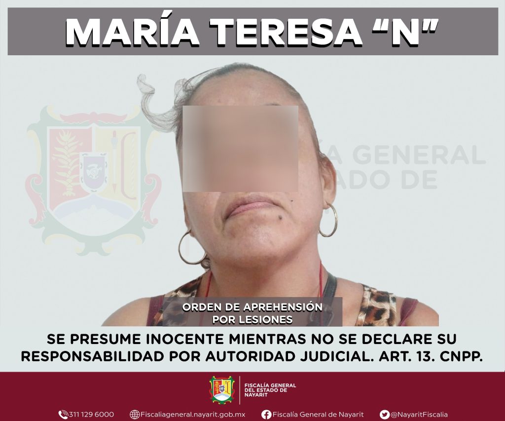 La Fiscalía General del Estado de Nayarit informa que elementos de la Agencia de Investigación Criminal ejecutaron una orden de aprehensión en el municipio de Acaponeta contra María Teresa “N”, por su probable participación en hechos que la ley tipifica como delito de lesiones, cometido en agravio de una mujer. La identidad de la víctima se reserva en respeto a su derecho a la privacidad e integridad.