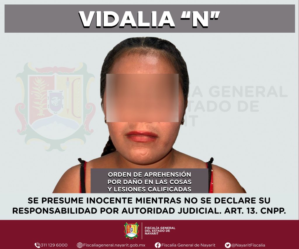 Elementos de la Agencia de Investigación Criminal de Nayarit ejecutaron una orden de aprehensión en el municipio de Rosamorada contra Vidalia “N”, por su presunta participación en hechos que la ley tipifica como delitos de daño en las cosas y lesiones calificadas, cometidos en agravio de una persona de sexo femenino de quien se reserva la identidad para salvaguardar su privacidad e integridad.