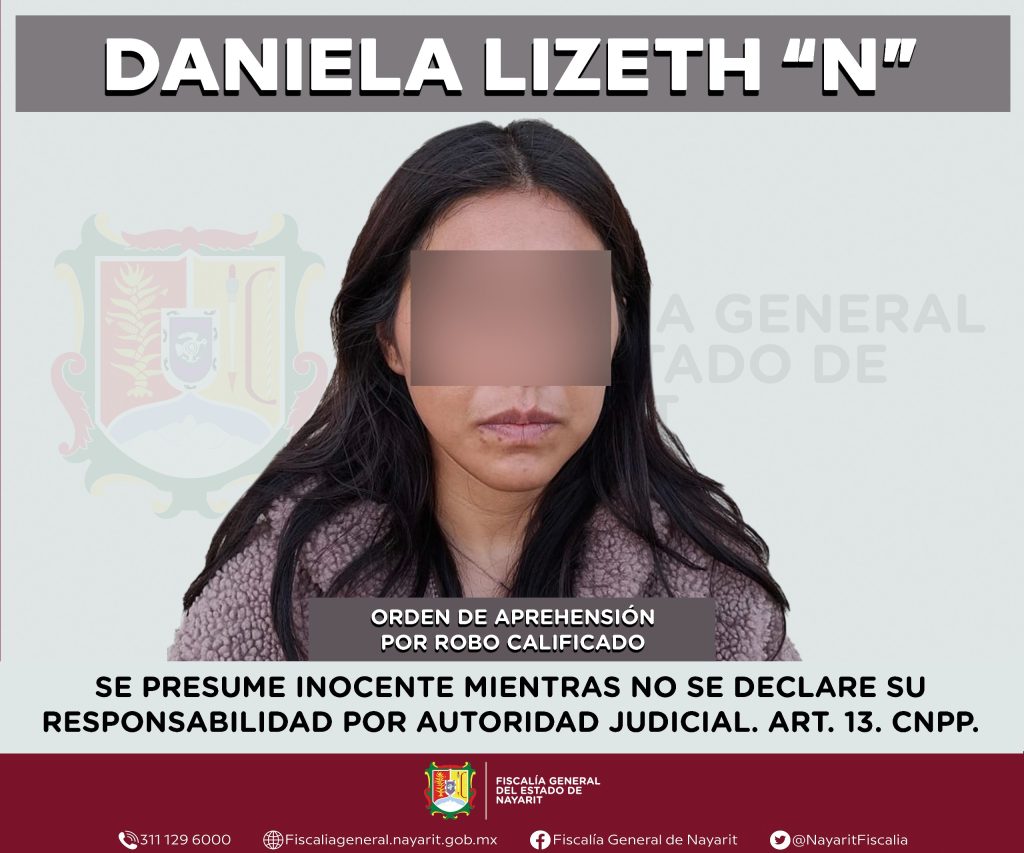 La Fiscalía General de Nayarit a través de la Agencia de Investigación Criminal ejecutó una orden de aprehensión en la ciudad de Tepic contra Daniela Lizeth “N”, por su probable participación en hechos que para la ley configuran el delito de robo calificado, cometido en agravio de una persona de sexo femenino de la cual se reserva la identidad para salvaguardar su privacidad e integridad.