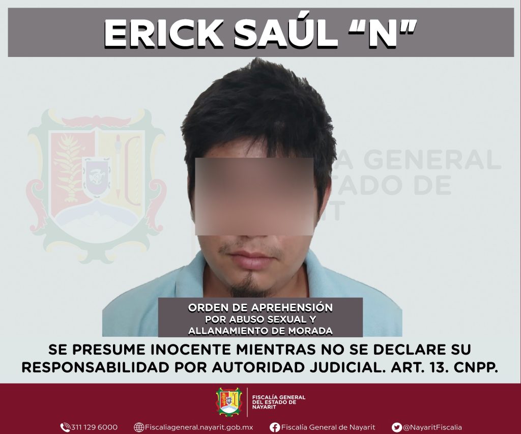 La Fiscalía General del Estado de Nayarit informa que elementos de la Agencia de Investigación Criminal ejecutaron una orden de aprehensión en la localidad Mezcales, municipio de Bahía de Banderas contra Erick Saúl “N”, por su presunta participación en hechos que la ley tipifica como delitos de abuso sexual y allanamiento de morada, cometidos en agravio de una persona de sexo femenino cuya identidad se reserva para proteger su privacidad e integridad.