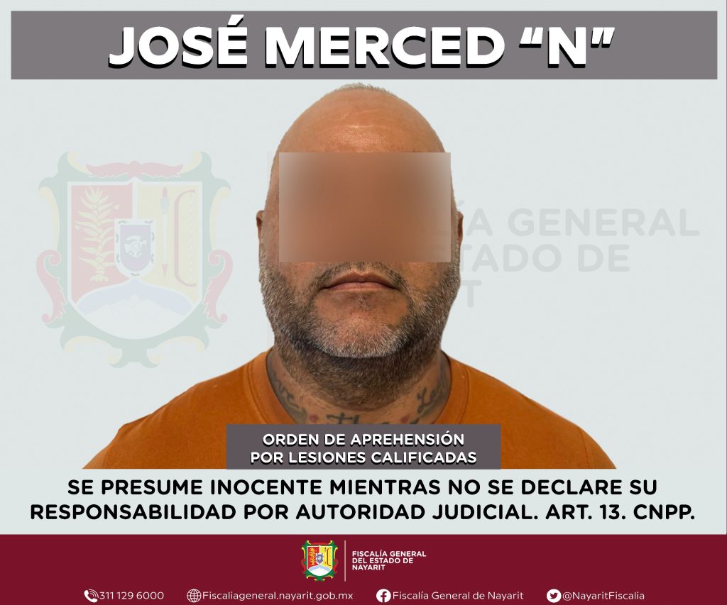 La Fiscalía General de Nayarit a través de la Agencia de Investigación Criminal ejecutó una orden de aprehensión en la localidad San Vicente, municipio de Bahía de Banderas contra José Merced “N”, por su presumible participación en hechos que para la ley configuran el delito de lesiones calificadas, cometido en agravio de una persona de sexo masculino de identidad reservada para salvaguardar su privacidad e integridad.