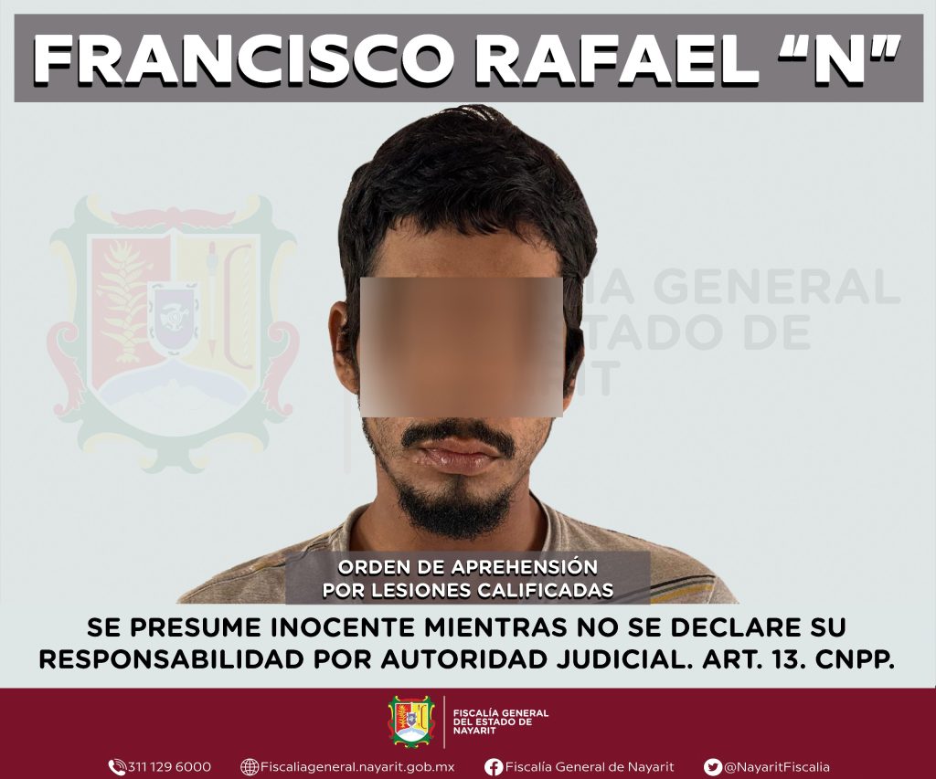 La Fiscalía General del estado de Nayarit informa que elementos de la Agencia de Investigación Criminal ejecutaron una orden de aprehensión en el municipio de Ruiz contra Francisco Rafael “N”, por su probable participación en hechos que la ley tipifica como delito de lesiones calificadas, cometido contra una persona de sexo masculino cuya identidad se reserva con el propósito de salvaguardar su privacidad e integridad.
