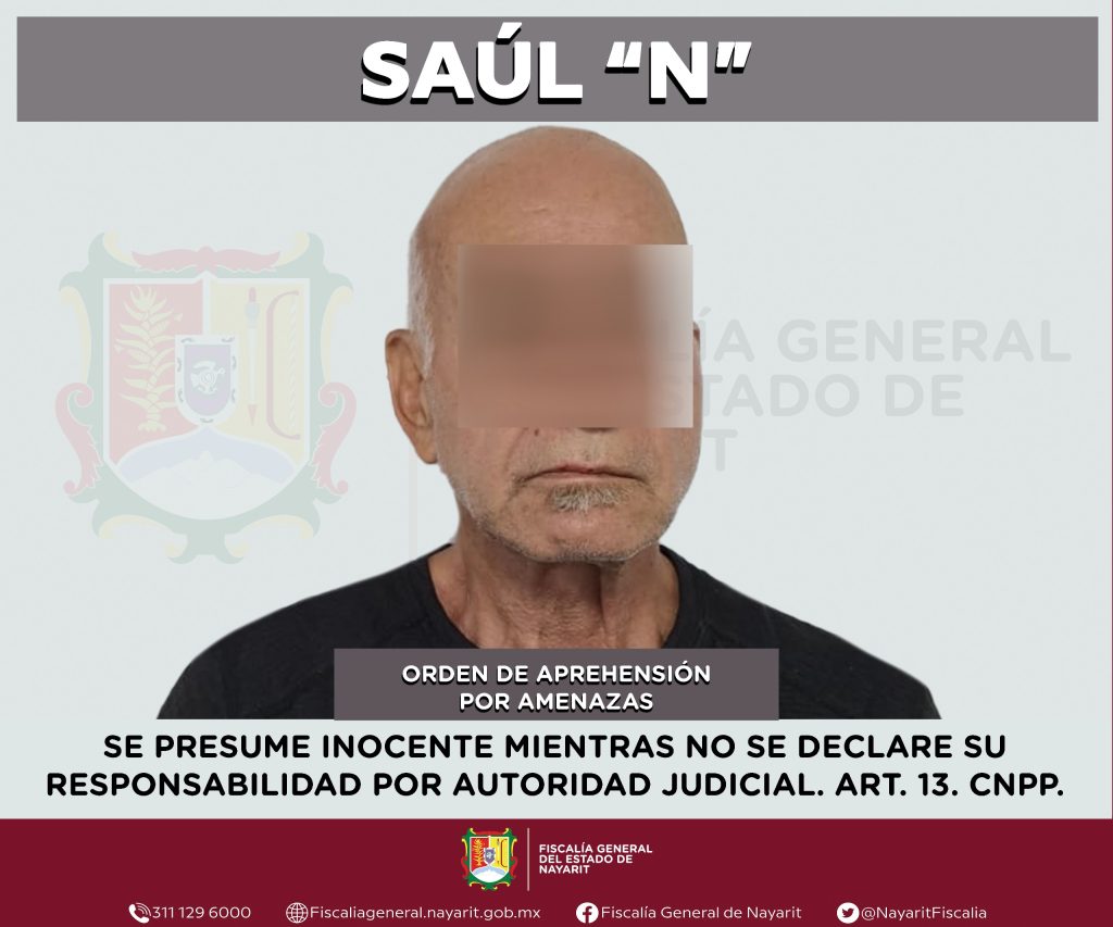 La Fiscalía General del Estado de Nayarit informa que a través de la Agencia de Investigación Criminal de Nayarit ejecutó una orden de aprehensión en la ciudad de Tepic contra Saúl “N”, por su presunta participación en hechos que la ley tipifica como delito de amenazas, cometido contra una persona de sexo femenino de quien se reserva la identidad para salvaguardar su privacidad e integridad.