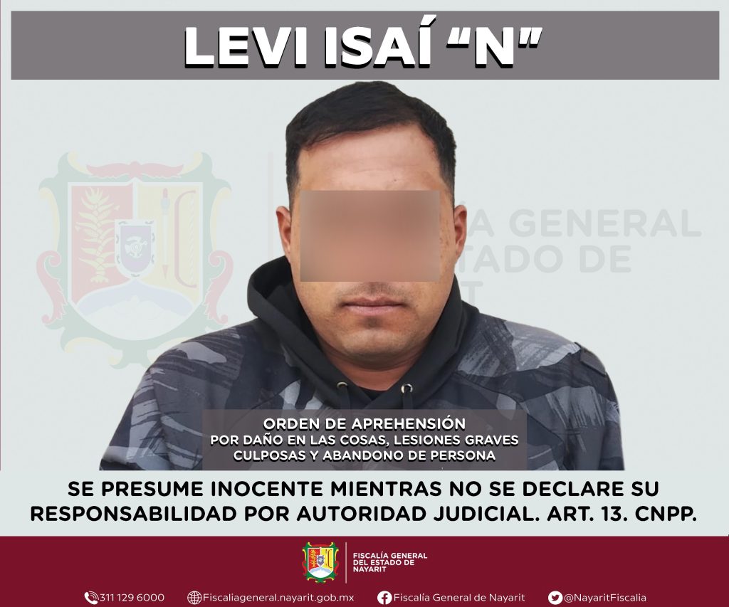 La Fiscalía General de Nayarit a través de la Agencia de Investigación Criminal ejecutó una orden de aprehensión en la localidad Mora, municipio de Tepic contra Levi Isaí “N”, por su probable participación en hechos que para la ley configuran los delitos de daño en las cosas, lesiones graves culposas y abandono de persona, cometidos en agravio de una persona de sexo femenino cuya identidad se reserva para salvaguardar su privacidad e integridad.
