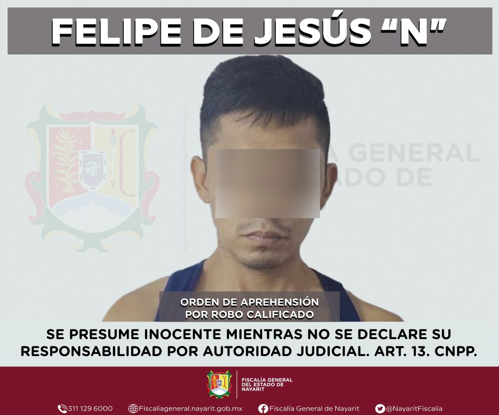 Elementos de la Agencia de Investigación Criminal de Nayarit ejecutaron una orden de aprehensión en la ciudad de Tepic contra Felipe de Jesús “N”, por su probable participación en hechos que la legislación vigente tipifica como delito de robo calificado, cometido en perjuicio de una persona de sexo masculino cuya identidad se reserva por respeto a su derecho a la privacidad e integridad.