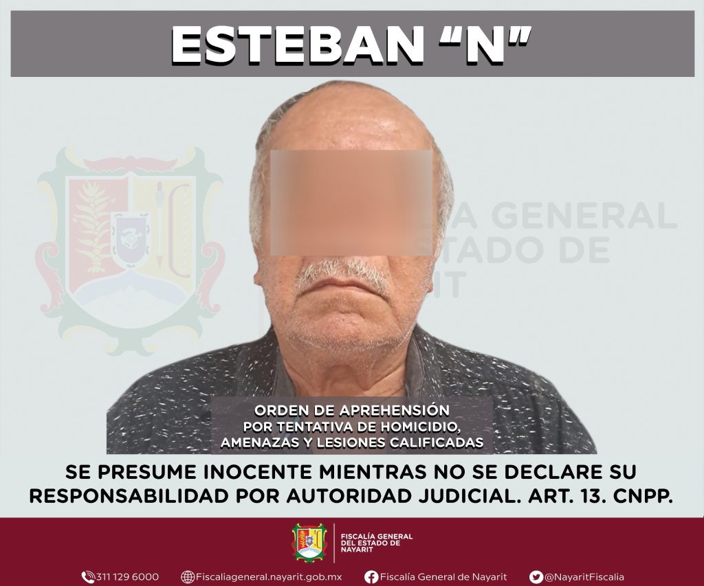 Elementos de la Agencia de Investigación Criminal de Nayarit ejecutaron una orden de aprehensión en la localidad Bucerías, municipio de Bahía de Banderas contra Esteban “N”, por su probable participación en hechos que la legislación vigente tipifica como delitos de homicidio en grado de tentativa, amenazas y lesiones calificadas, cometidos en agravio de una persona de sexo masculino. Respetando el derecho a la privacidad e integridad de la víctima se reserva su identidad.
