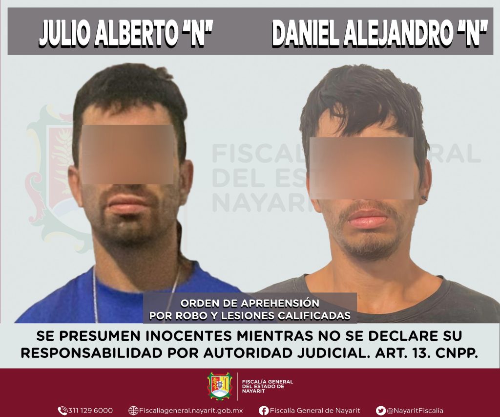 La Fiscalía General de Nayarit a través de la Agencia de Investigación Criminal ejecutó una orden de aprehensión en el municipio de Bahía de Banderas contra Daniel Alejandro “N” y Julio Alberto “N”, por su presunta participación en hechos que según apreciación de la ley encuadran los delitos de robo y lesiones calificadas, cometidos en agravio de dos personas cuyas identidades se reservan.