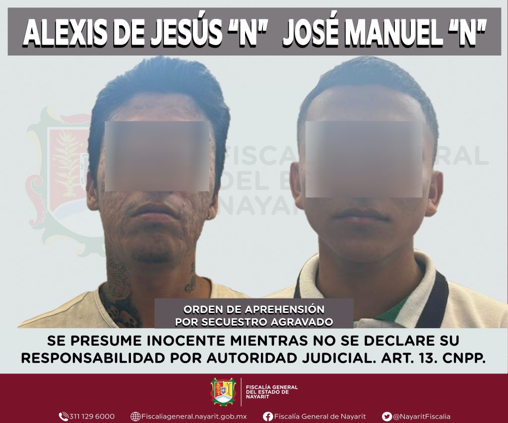 La Fiscalía General de Nayarit informa que a través de la Agencia de Investigación Criminal ejecutó una orden de aprehensión en la capital nayarita contra José Manuel “N” y Alexis de Jesús “N”, por su presunta participación en hechos que la ley tipifica como delito de secuestro agravado, cometido en agravio de una persona de sexo masculino cuya identidad se reserva con la intención de salvaguardar su privacidad e integridad.