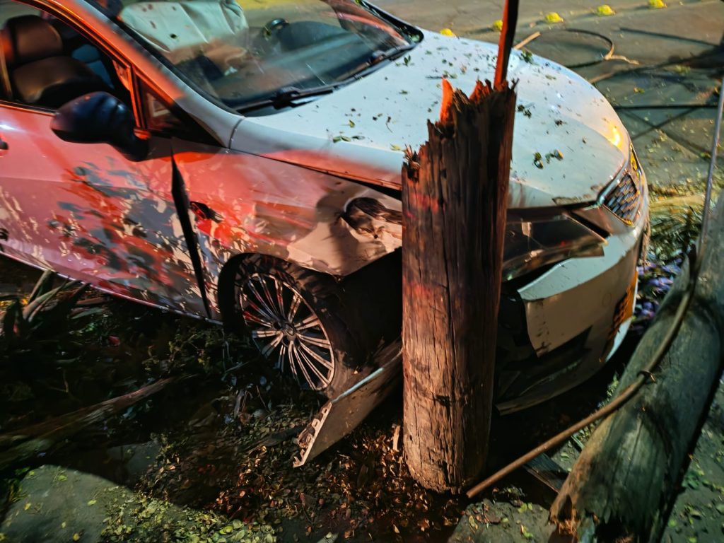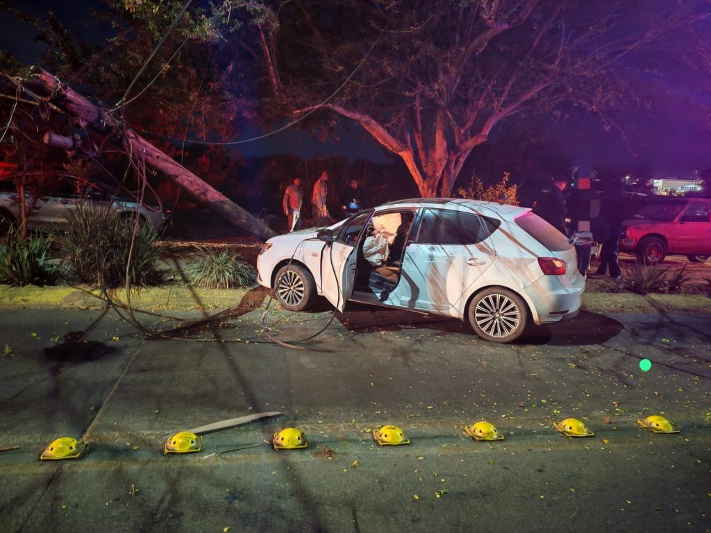 Cuando los Bomberos Estatales arribaron al lugar observaron un vehículo de la marca Seat, sub marca Ibiza, en color blanco, impactado contra un poste de la compañía de cable Telmex.