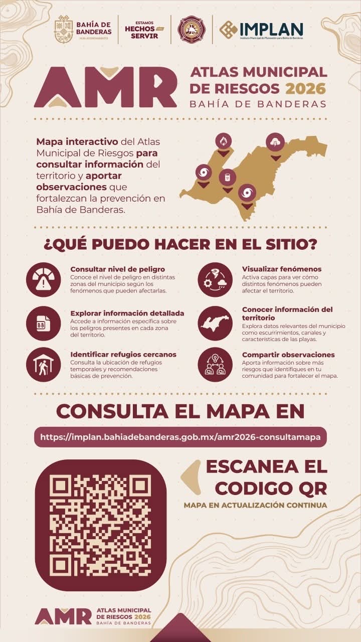 El Gobierno Municipal de Bahía de Banderas informó sobre los avances significativos en la actualización del Atlas de Riesgo 2026, una herramienta estratégica que permitirá identificar, consultar y prevenir los riesgos a los que está expuesta la población en el municipio.