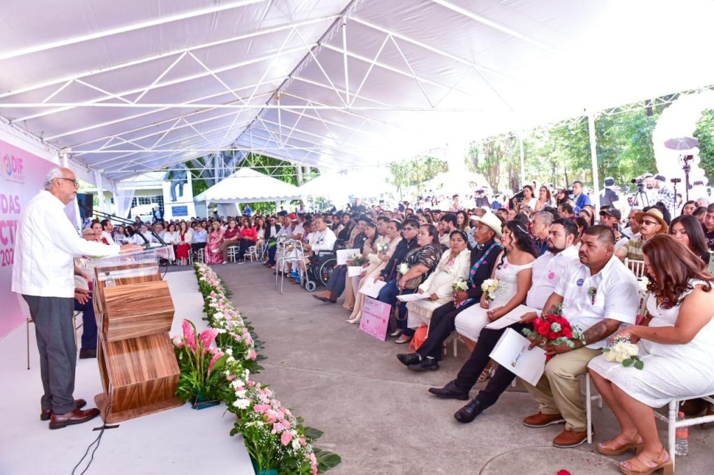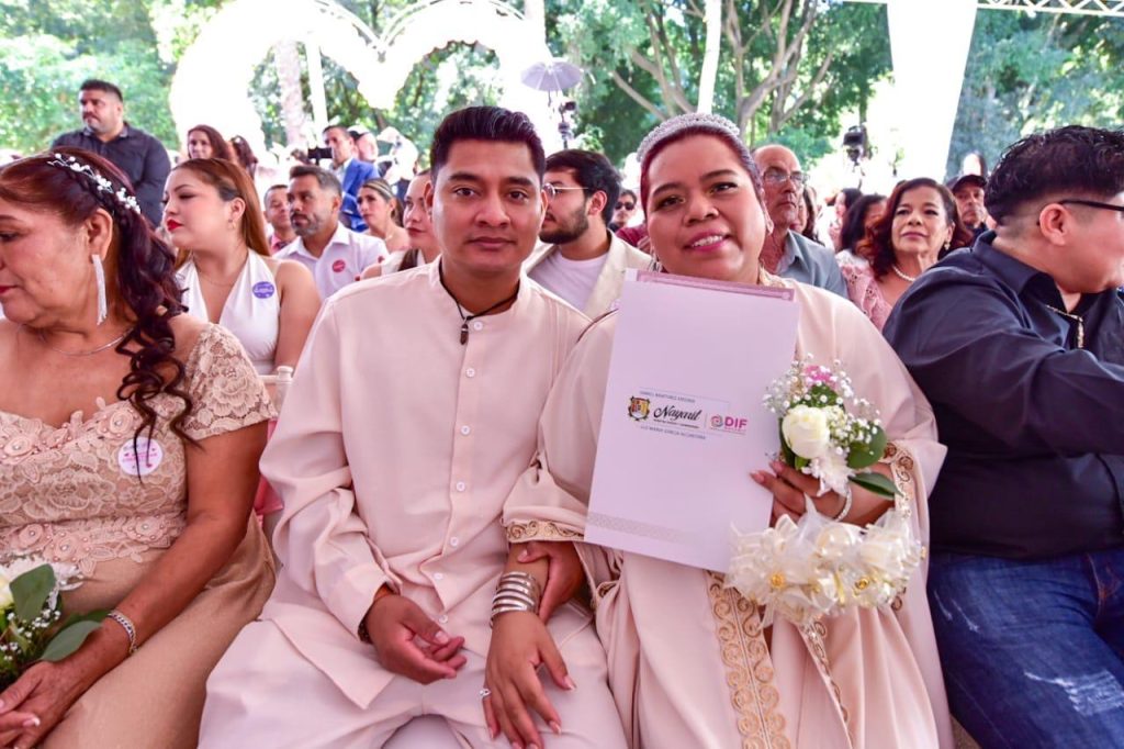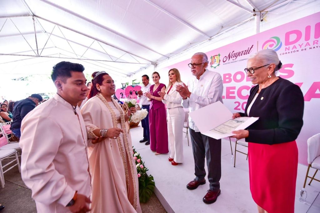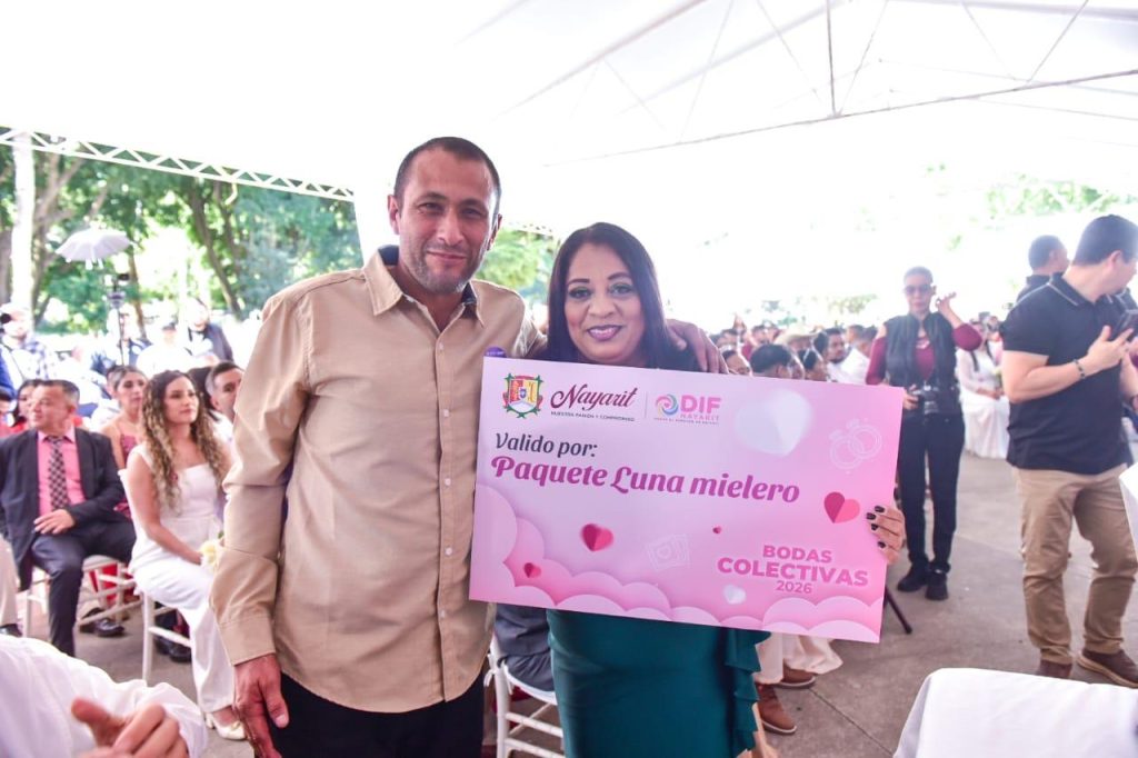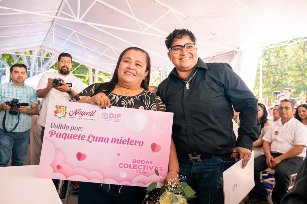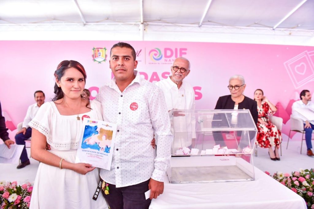 El mandatario estatal y la presidenta del Sistema DIF Nayarit felicitaron a las nuevas parejas por dar este paso que fortalece el tejido social en la entidad. Como parte de la celebración, se realizó la rifa de seis viajes de luna de miel para las y los recién casados.