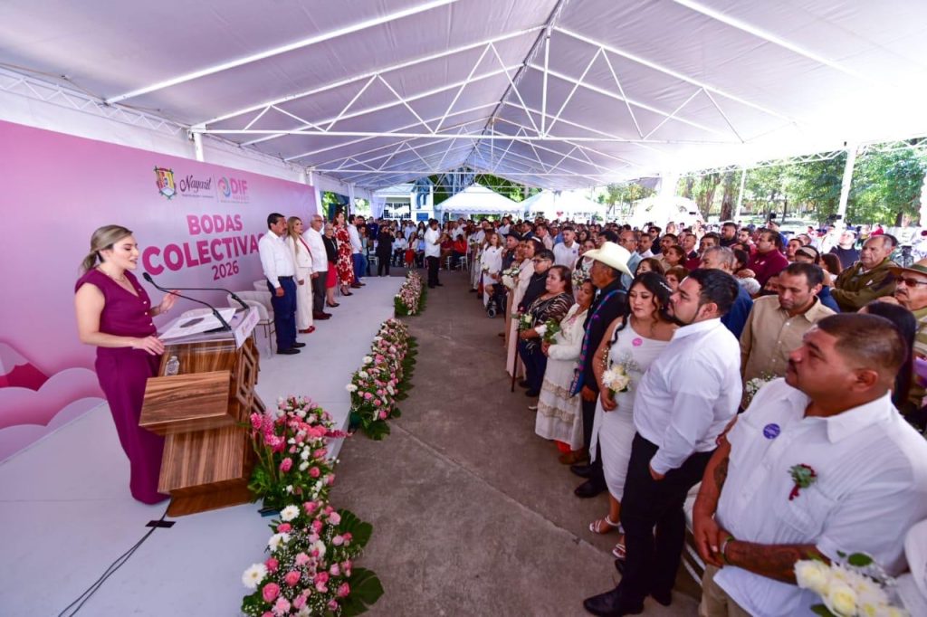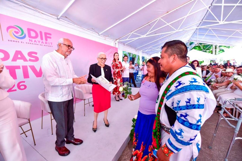 En un ambiente de alegría y cercanía, 126 parejas provenientes de distintos municipios de la entidad formalizaron su unión durante las Bodas Colectivas 2026, encabezadas por la presidenta del Sistema DIF Nayarit, doctora Beatriz Estrada Martínez, y el gobernador del estado, Miguel Ángel Navarro Quintero.