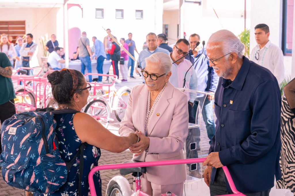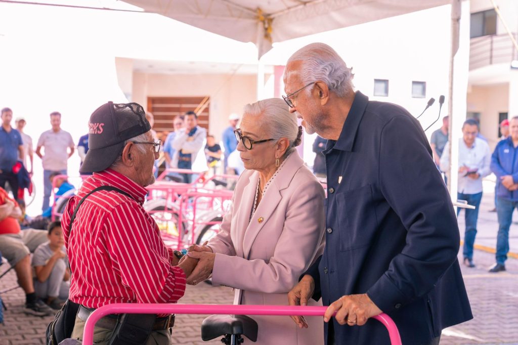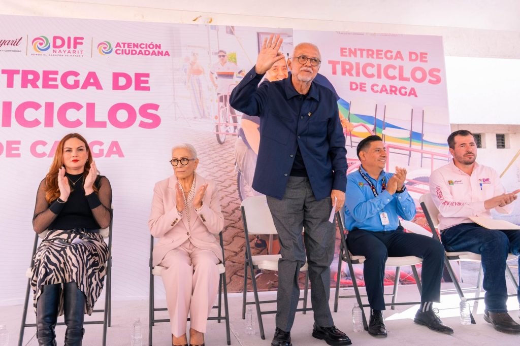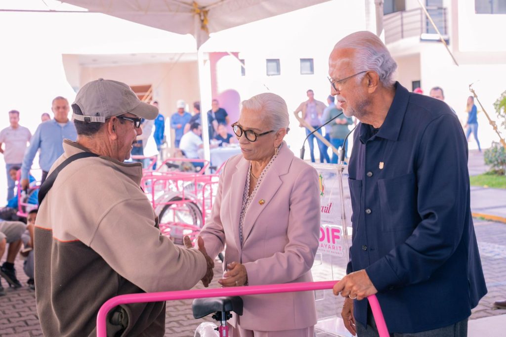 La presidenta del Sistema DIF Nayarit, doctora Beatriz Estrada Martínez, y su esposo, el gobernador del estado, Miguel Ángel Navarro Quintero, realizaron la entrega de triciclos de carga a 130 familias de 18 municipios de la entidad, una acción que fortalece el autoempleo y respalda el esfuerzo diario de quienes buscan generar ingresos propios y mejorar su calidad de vida.