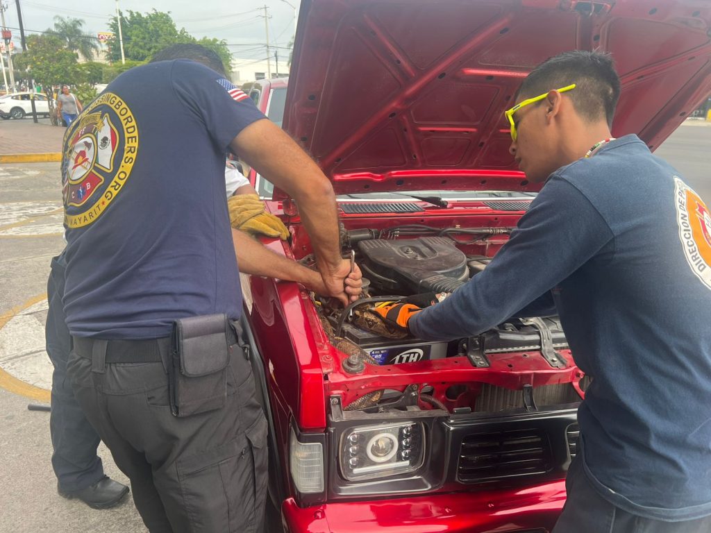 El hecho se registró cuando la propietaria del automóvil solicitó el apoyo de los elementos bomberiles, luego de escuchar ruidos inusuales provenientes de su unidad. Durante la inspección correspondiente, el personal especializado confirmó la presencia del reptil y procedió a su resguardo de manera segura y controlada.