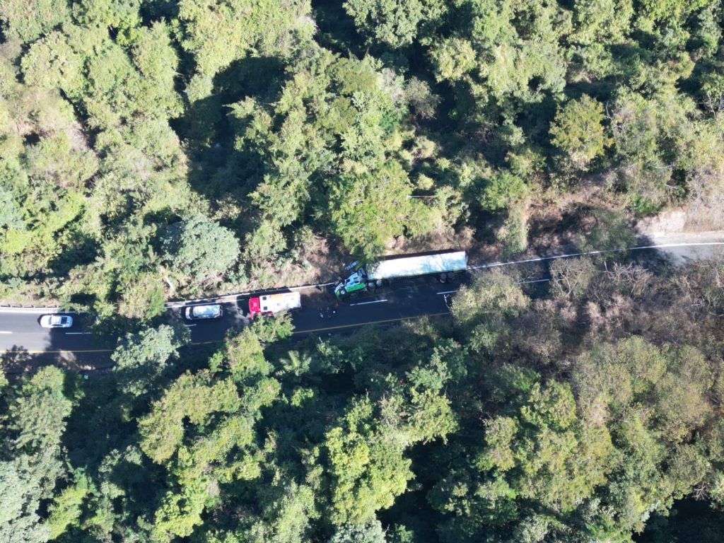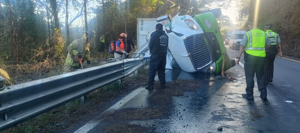 Ante este hecho, elementos de Protección Ciudadana y Bomberos con sede en la base central de Tepic tomaron informe del suceso y se dirigieron al lugar señalado, donde se encontró un tráiler de color blanco, mismo que sufrió una volcadura, impactando contra la barra de contención.