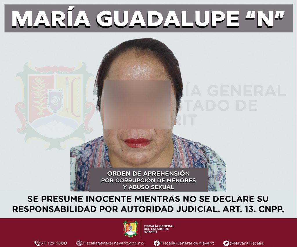 La Fiscalía General de Nayarit a través de la Agencia de Investigación Criminal ejecutó una orden de aprehensión en la localidad Las Varas, municipio de Compostela contra María Guadalupe “N”, por su presumible participación en hechos que para la ley configuran los delitos de corrupción de menores o incapaces y abuso sexual, en agravio de una persona menor de edad cuya identidad se reserva para salvaguardar su privacidad e integridad.