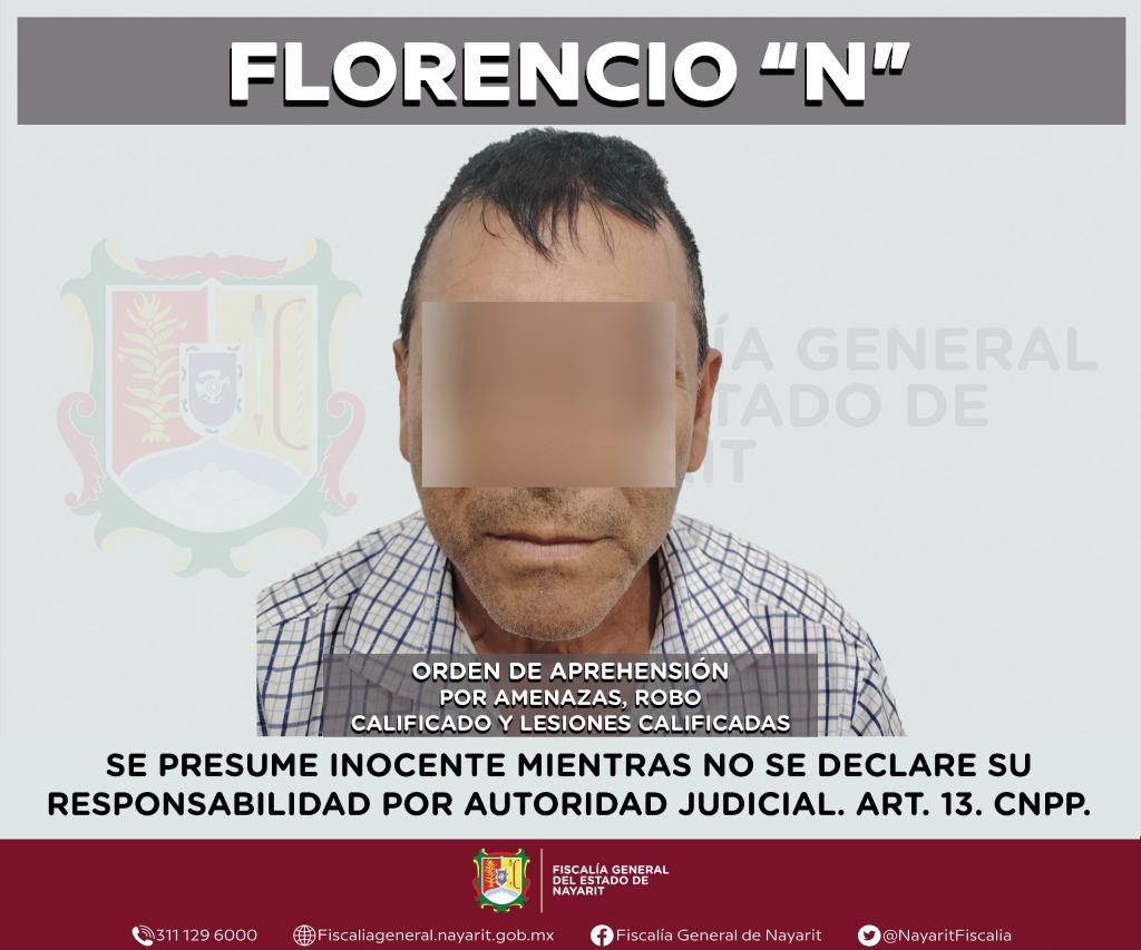 La Fiscalía General del estado de Nayarit informa que elementos de la Agencia de Investigación Criminal ejecutaron una orden de aprehensión en la localidad Las Varas, municipio de Compostela contra Florencio “N”, por su probable participación en hechos que la ley tipifica como delitos de amenazas, robo calificado y lesiones calificadas.