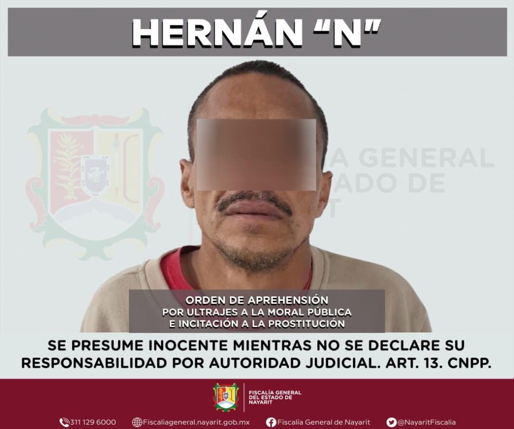 La Fiscalía General del estado de Nayarit informa que elementos de la Agencia de Investigación Criminal ejecutaron una orden de aprehensión en la ciudad de Tepic contra Hernán “N”, por su probable participación en hechos que la ley tipifica como delitos de ultrajes a la moral pública o a las buenas costumbres e incitación a la prostitución, cometidos contra una adolescente cuya identidad se reserva con el propósito de salvaguardar su privacidad e integridad.