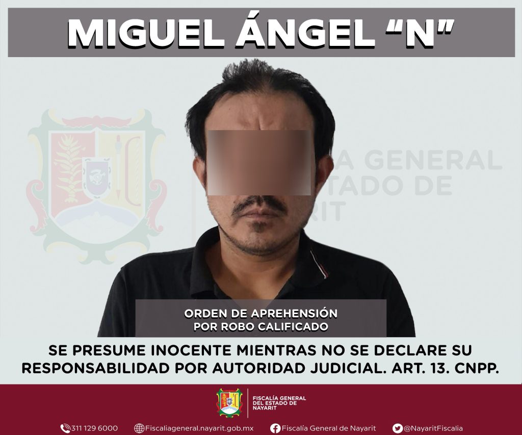 La Fiscalía General del estado de Nayarit informa que elementos de la Agencia de Investigación Criminal ejecutaron una orden de aprehensión contra Miguel Ángel “N”, por su probable participación en hechos que la legislación vigente tipifica como delito de robo calificado, cometido en perjuicio de una persona de sexo masculino de quien se reserva la identidad respetando su derecho a la privacidad e integridad.