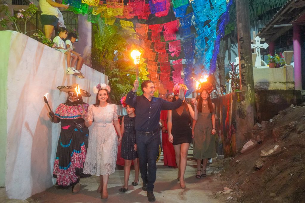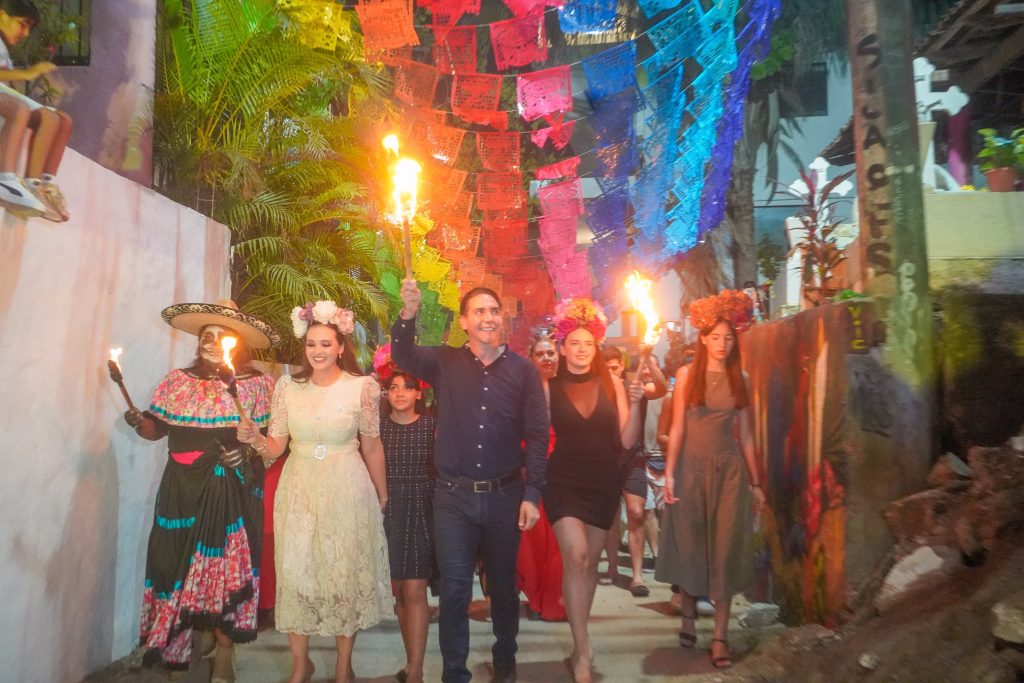Acompañado de música y del pueblo de Sayulita se realizó la procesión que encabezó por el presidente municipal, Héctor Javier Santana García, acompañado de su esposa, Margui Zúñiga, y sus hijas, quienes compartieron con las familias locales este recorrido simbólico lleno de vida y significado.
