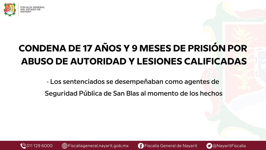 Tepic, Nayarit; 28 de octubre de 2025. – La Fiscalía General del estado de Nayarit informa que un Tribunal de Enjuiciamiento dictó sentencia condenatoria de 17 años y 9 meses de prisión contra Germán “N”, Romualdo “N” y Fernando “N”, tras acreditarse su responsabilidad penal en los delitos de abuso de autoridad y lesiones calificadas.