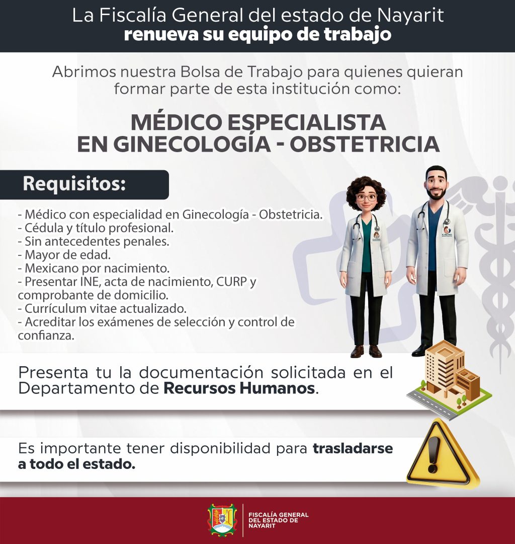 Como parte de la estrategia de mejora continua, la Fiscalía General del Estado de Nayarit convoca a las personas interesadas en integrarse como: Médico Especialista en GinecologÍa – Obstetricia.
