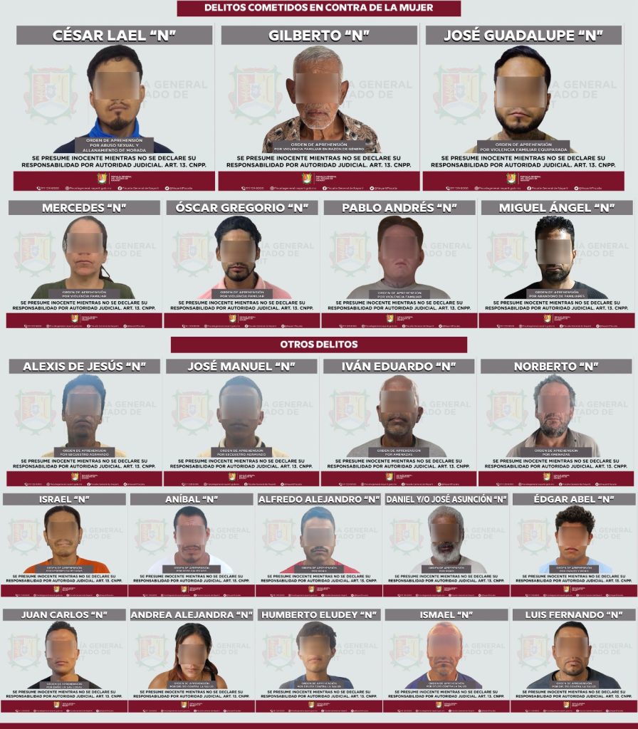 Como parte de las acciones permanentes para el combate a la delincuencia y el fortalecimiento del Estado de derecho, la Fiscalía General del Estado de Nayarit informa que los días 17 y 18 de marzo dio cumplimiento a 24 órdenes de aprehensión en distintos municipios de la entidad.