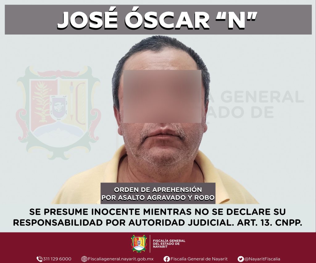 La Fiscalía General de Nayarit a través de la Agencia de Investigación Criminal ejecutó una orden de aprehensión en el municipio de Bahía de Banderas contra José Óscar “N”, por su presumible participación en hechos que para la ley configuran los delitos de asalto agravado y robo, cometidos en agravio de dos personas de sexo masculino cuyas identidades son reservadas para salvaguardar su privacidad e integridad.