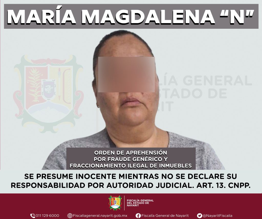 La Fiscalía General de Nayarit a través de la Agencia de Investigación Criminal ejecutó una orden de aprehensión en el municipio de Xalisco contra María Magdalena “N”, por su probable participación en hechos que para la ley configuran los delitos de fraude genérico y fraccionamineto ilegal de inmuebles, ilícitos cometidos contra tres personas -dos de sexo femenino y una de sexo masculino-, de las cuales se reservan las identidades para salvaguardar su privacidad e integridad.