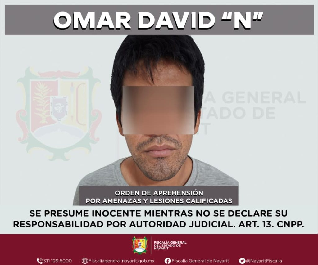La Fiscalía General de Nayarit a través de la Agencia de Investigación Criminal ejecutó una orden de aprehensión en el municipio de Acaponeta contra Omar David “N”, por su presumible participación en hechos que para la ley configuran los delitos de amenazas y lesiones calificadas, cometidos contra una persona de sexo femenino de quien se reserva la identidad para salvaguardar su privacidad e integridad.