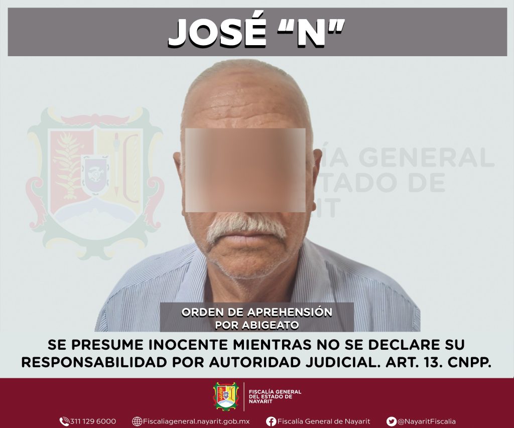 La Fiscalía General del estado de Nayarit informa que elementos de la Agencia de Investigación Criminal ejecutaron una orden de reaprehensión en el municipio de Tecuala contra José “N”, por su probable participación en hechos que la legislación vigente tipifica como delito de abigeato, cometido contra una persona de sexo masculino de quien se reserva la identidad respetando su derecho a la privacidad e integridad.