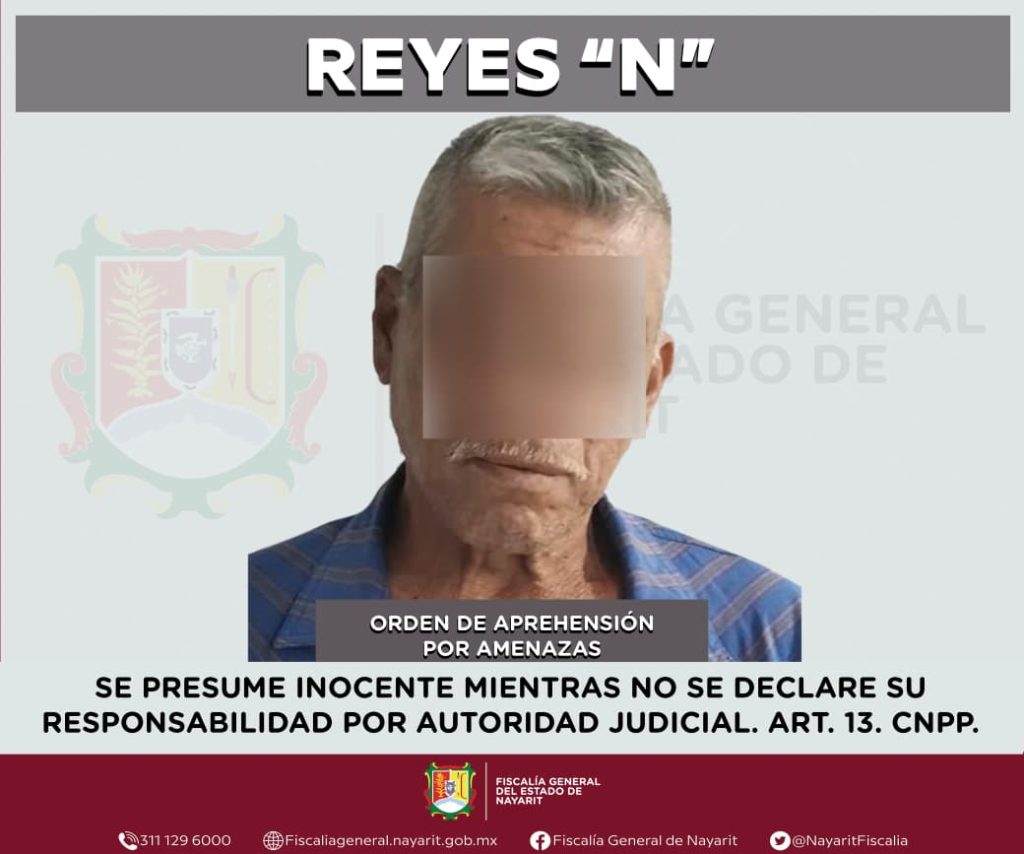 La Fiscalía General de Nayarit a través de la Agencia de Investigación Criminal ejecutó una orden de aprehensión en la localidad El Testerazo, municipio de Xalisco contra Reyes “N”, por su presumible participación en hechos que para la ley configuran el delito de amenazas, ilícito cometido contra una persona de sexo masculino. La identidad del ofendido se reserva para salvaguardar su privacidad e integridad.
