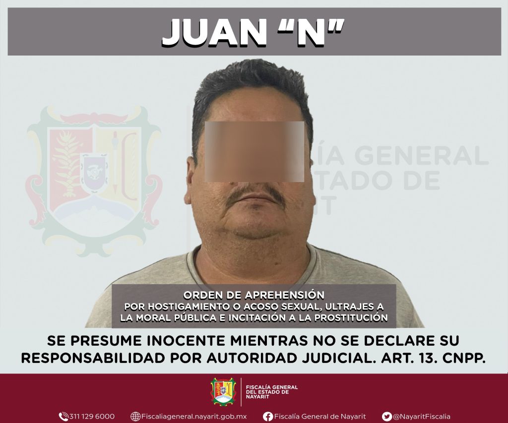 Elementos de la Agencia de Investigación Criminal de Nayarit ejecutaron una orden de aprehensión en la ciudad de Tepic contra Juan “N”, por su probable participación en hechos que la legislación vigente tipifica como delitos de hostigamiento o acoso sexual, ultrajes a la moral pública o las buenas costumbres e incitación a la prostitución, cometidos en agravio de dos personas cuyas identidades se reservan en atención a su derecho a la privacidad e integridad.