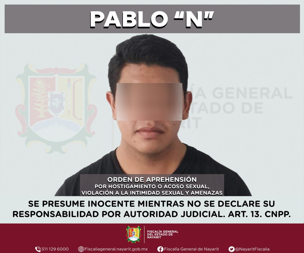 La Fiscalía General del estado de Nayarit informa que elementos de la Agencia de Investigación Criminal ejecutaron una orden de aprehensión en la ciudad de Tepic contra Pablo “N”, por su probable participación en hechos que la ley tipifica como delitos de hostigamiento o acoso sexual, violación a la intimidad sexual y amenazas, cometidos contra una persona de sexo femenino de quien por respeto a su derecho a la privacidad e integridad se reserva la identidad.