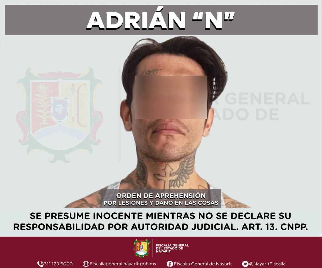 La Fiscalía General del estado de Nayarit informa que elementos de la Agencia de Investigación Criminal ejecutaron una orden de aprehensión en la ciudad de Tepic contra Adrián “N”, por su probable participación en hechos que la ley tipifica como delitos de lesiones y daño en las cosas, cometidos en agravio de dos personas de sexo masculino y un menor de edad, cuyas identidades se mantienen bajo reserva por respeto a su derecho a la privacidad e integridad.