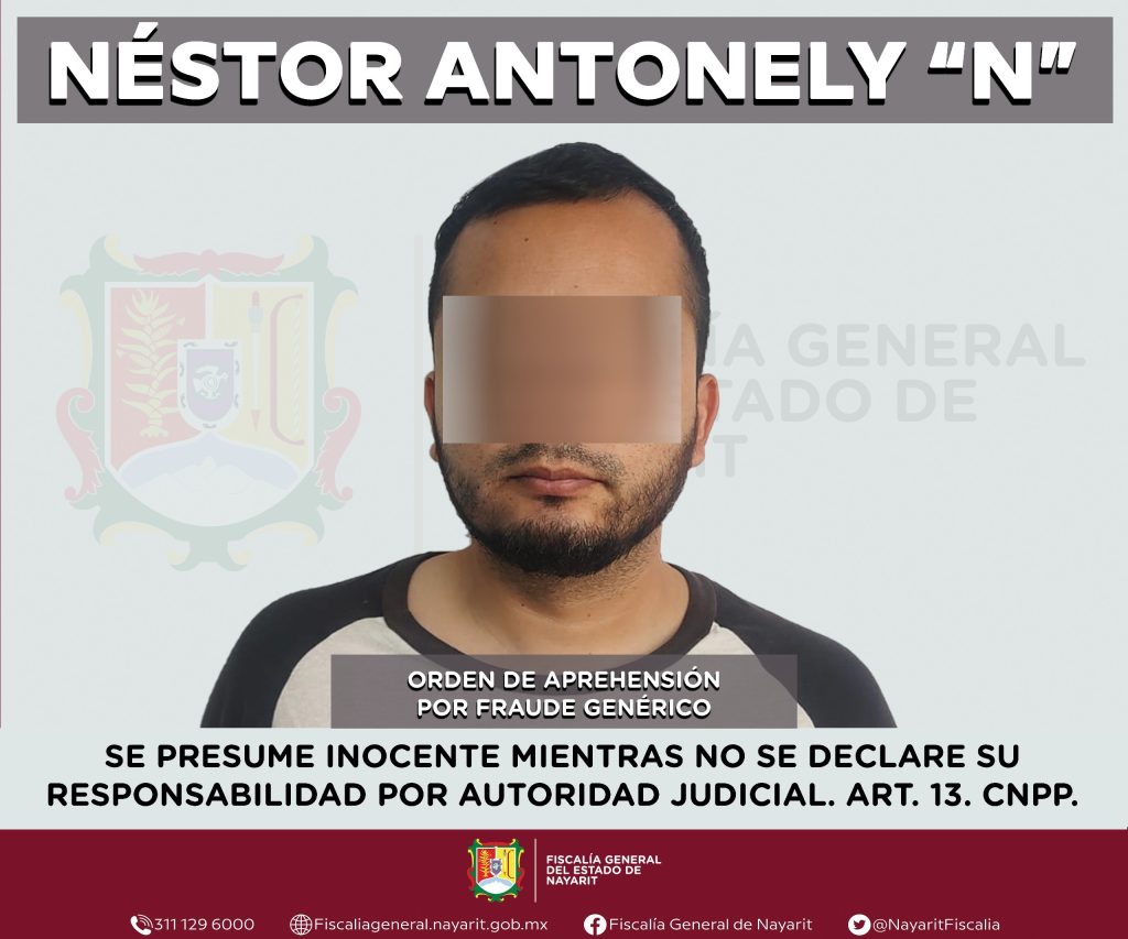 La Fiscalía General del estado de Nayarit a través de la Agencia de Investigación Criminal ejecutó una orden de aprehensión contra Néstor Antonely “N”, por su probable participación en hechos que para la ley configuran el delito de fraude genérico, en perjuicio de una persona de sexo masculino cuya identidad queda bajo reserva para salvaguardar su privacidad e integridad.