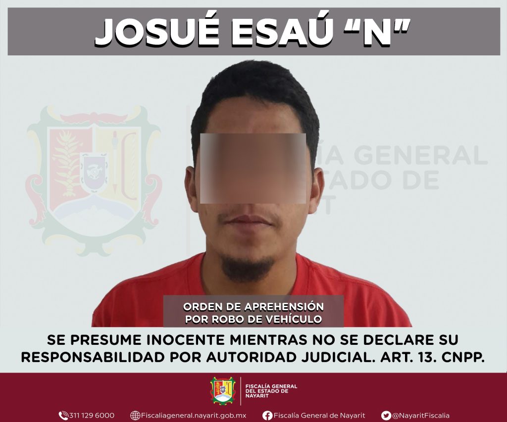 La Fiscalía General del estado de Nayarit informa que elementos de la Agencia de Investigación Criminal ejecutaron una orden de aprehensión contra Josué Esaú “N”, por su probable participación en hechos que la legislación vigente tipifica como delito de robo calificado -vehículo-, cometido en agravio de una persona de sexo masculino cuya identidad se reserva por respeto a su derecho a la privacidad e integridad.