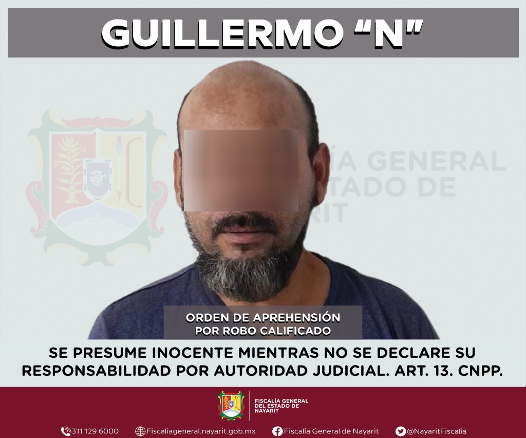 La Fiscalía General del estado de Nayarit informa que elementos de la Agencia de Investigación Criminal ejecutaron una orden de aprehensión contra Guillermo “N”, por su probable participación en hechos que la ley tipifica como delito de robo calificado, cometido en agravio de una persona de sexo femenino cuya identidad es de carácter reservado para proteger su derecho a la privacidad e integridad.