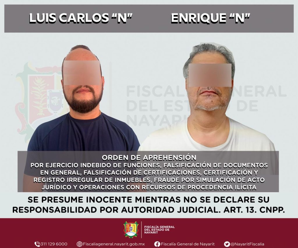 Tepic, Nayarit; 28 de noviembre de 2025.– La Fiscalía General del estado de Nayarit informa que fueron cumplimentadas dos órdenes de aprehensión en contra de Enrique “N” y Luis Carlos “N”, por su probable participación en hechos que la ley sanciona como ejercicio indebido de funciones, falsificación de documentos en general, falsificación de certificaciones, certificación y registro irregular de inmuebles, fraude por simulación de acto jurídico y operaciones con recursos de procedencia ilícita.