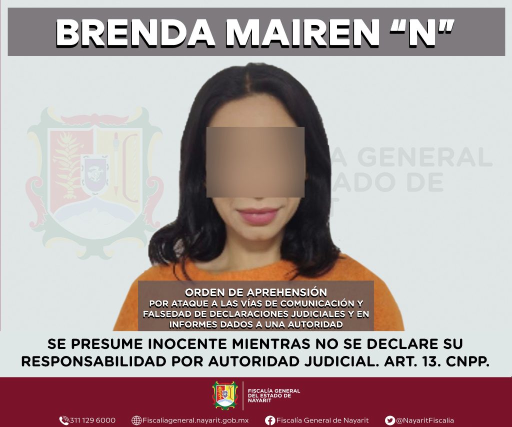 Elementos de la Agencia de Investigación Criminal de Nayarit ejecutaron una orden de aprehensión contra Brenda Mairen “N”, por su probable participación en hechos que para la ley configuran los delitos de ataques a las vías de comunicación, falsedad en declaraciones judiciales y en informes dados a una autoridad, cometidos en agravio de la Secretaría de Infraestructura del Estado de Nayarit y de la sociedad.