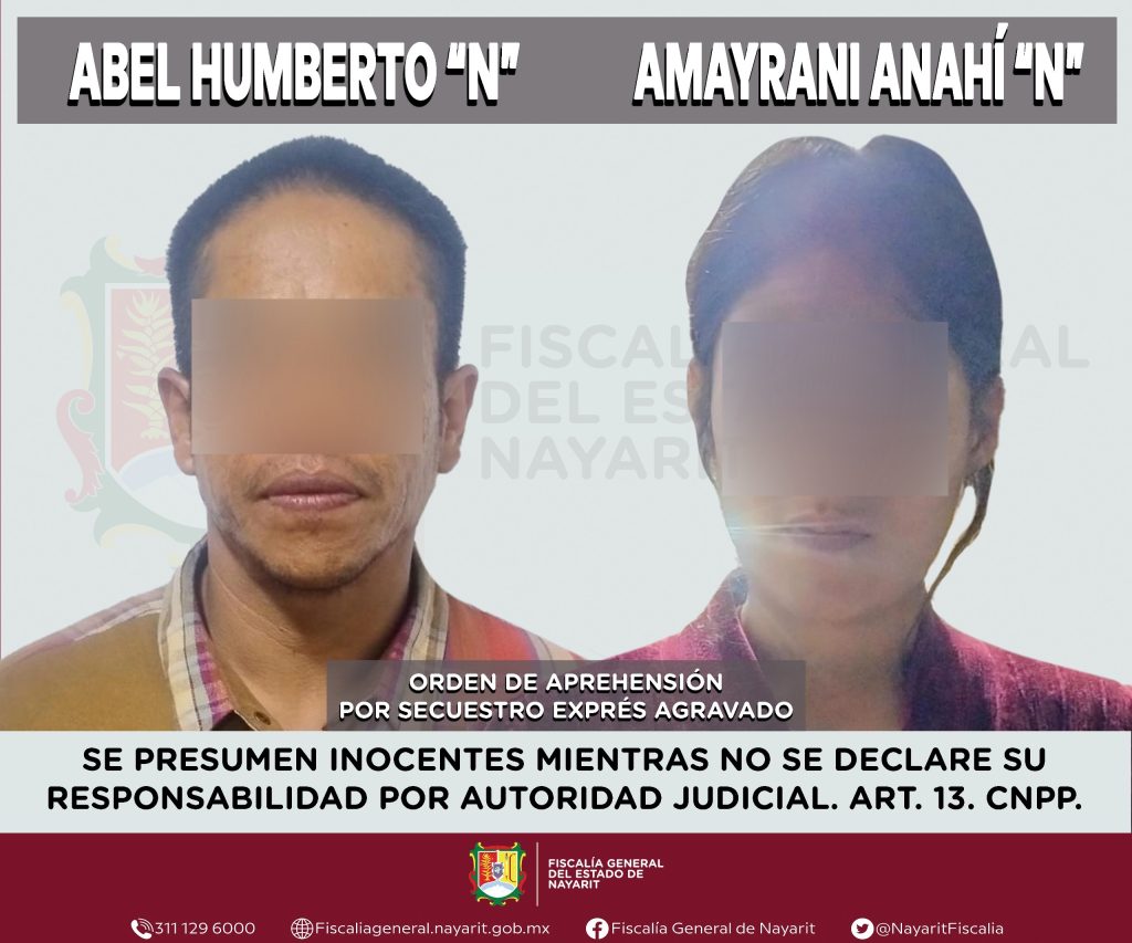 Elementos de la Agencia de Investigación Criminal de Nayarit ejecutaron una orden de aprehensión contra Amayrani Anahí “N” y Abel Humberto “N”, por su probable participación en hechos que para la ley configuran el delito de secuestro exprés agravado, cometido en contra de dos personas de las cuales se reservan las identidades para salvaguardar su privacidad e integridad.