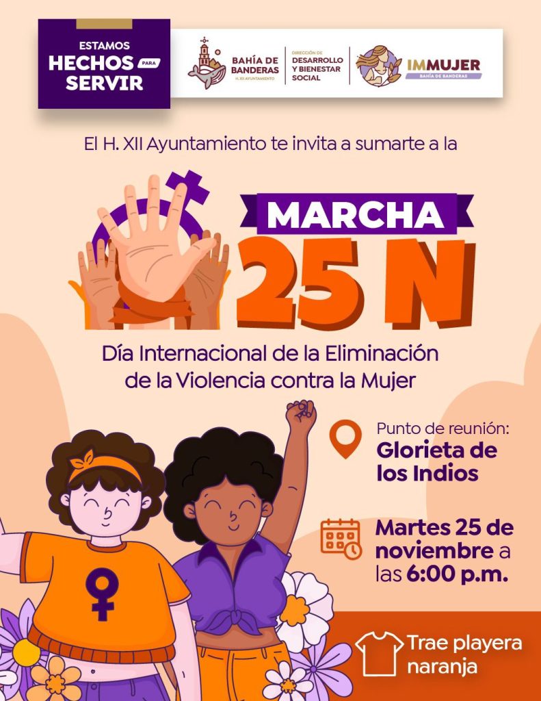 El H. XII Ayuntamiento de Bahía de Banderas, que encabeza el presidente municipal Héctor Santana, invita a todas y todos los habitantes del municipio a sumarse a la Marcha 25N, esto en el marco del Día Internacional de la Eliminación de la Violencia contra la Mujer. Esta marcha busca visibilizar la importancia de erradicar cualquier forma de violencia de género y promover entornos seguros para todas las mujeres y niñas del municipio.