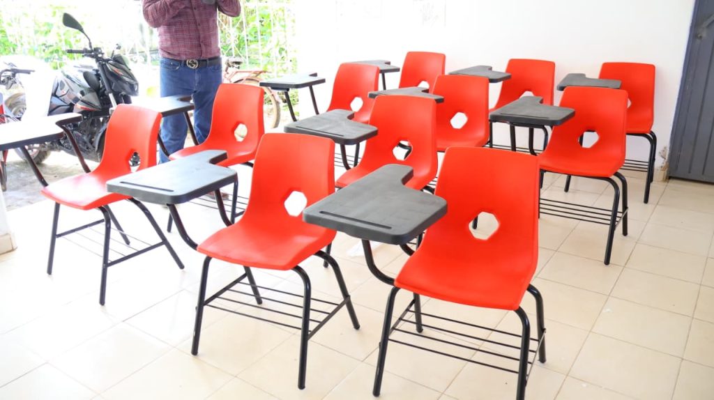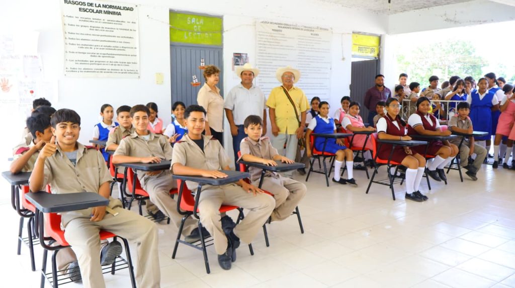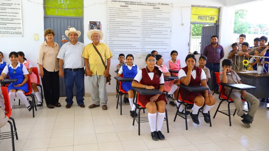 Rosamorada, Nayarit. – En respuesta a una solicitud expresa de maestros, alumnos y padres de familia, el presidente municipal de Rosamorada, Ampelio Gutiérrez, encabezó la entrega de sillas escolares en la Secundaria Federal Ignacio Manuel Altamirano, ubicada en la comunidad de Chilapa.