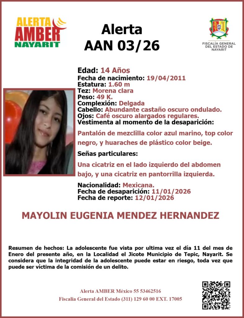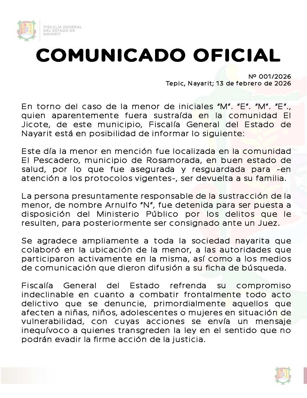 La Fiscalía General del Estado de Nayarit informó, mediante el Comunicado Oficial No. 001, que fue localizada una menor de iniciales “M. E. M. E.”, quien presuntamente había sido sustraída en la comunidad El Jicote, municipio de Tepic.