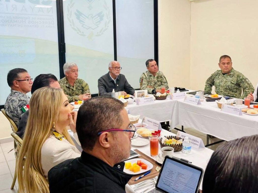 Tepic, Nayarit.– El gobernador del estado, Dr. Miguel Ángel Navarro Quintero, encabezó esta mañana una sesión de trabajo de la Mesa Estatal de Construcción de Paz y Seguridad, realizada en las instalaciones de la Comisión de Derechos Humanos de Nayarit, con la participación de autoridades de los tres niveles de gobierno.