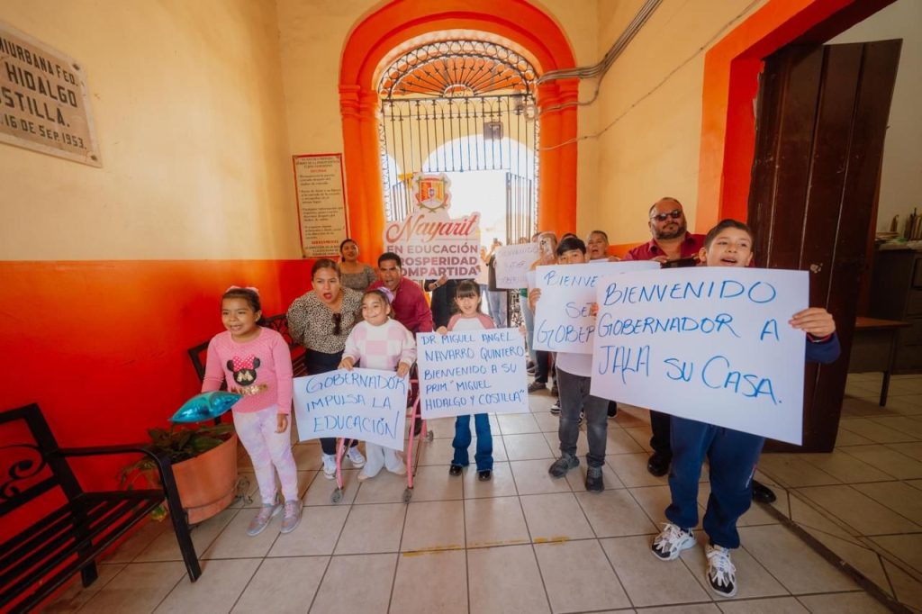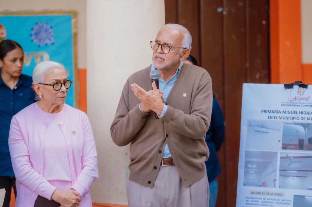Jala, Nayarit. — Este domingo, durante su gira de trabajo por el municipio de Jala, el gobernador del estado, Miguel Ángel Navarro Quintero, acompañado de su esposa, la doctora Beatriz Estrada Martínez, presidenta del Sistema DIF Nayarit, entregó obras de mejoramiento en la escuela primaria Miguel Hidalgo y Costilla, con el objetivo de fortalecer las condiciones en las que niñas y niños desarrollan su aprendizaje.