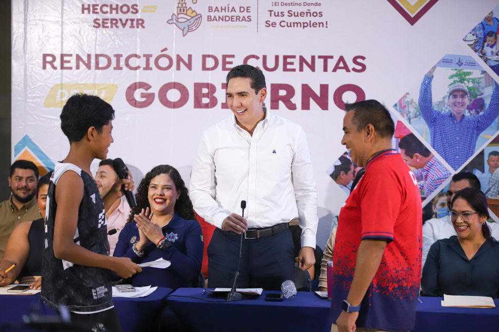 El presidente municipal de Bahía de Banderas, Héctor Santana, encabezó una nueva Rendición de Cuentas, donde compartió las principales acciones y avances de su gobierno. Durante su mensaje, destacó la visita del gobernador del estado, Miguel Ángel Navarro Quintero, con quien participó en el Congreso Nacional de Escuelas Normales Superiores y en la inauguración del Hotel Único, en Nuevo Nayarit, un nuevo complejo turístico que —dijo— impulsa la inversión y el desarrollo económico del municipio. Santana García también expresó su agradecimiento porque el huracán reciente no provocó daños graves en Bahía de Banderas, aunque se mantiene un monitoreo constante a través de la Dirección de Protección Civil.