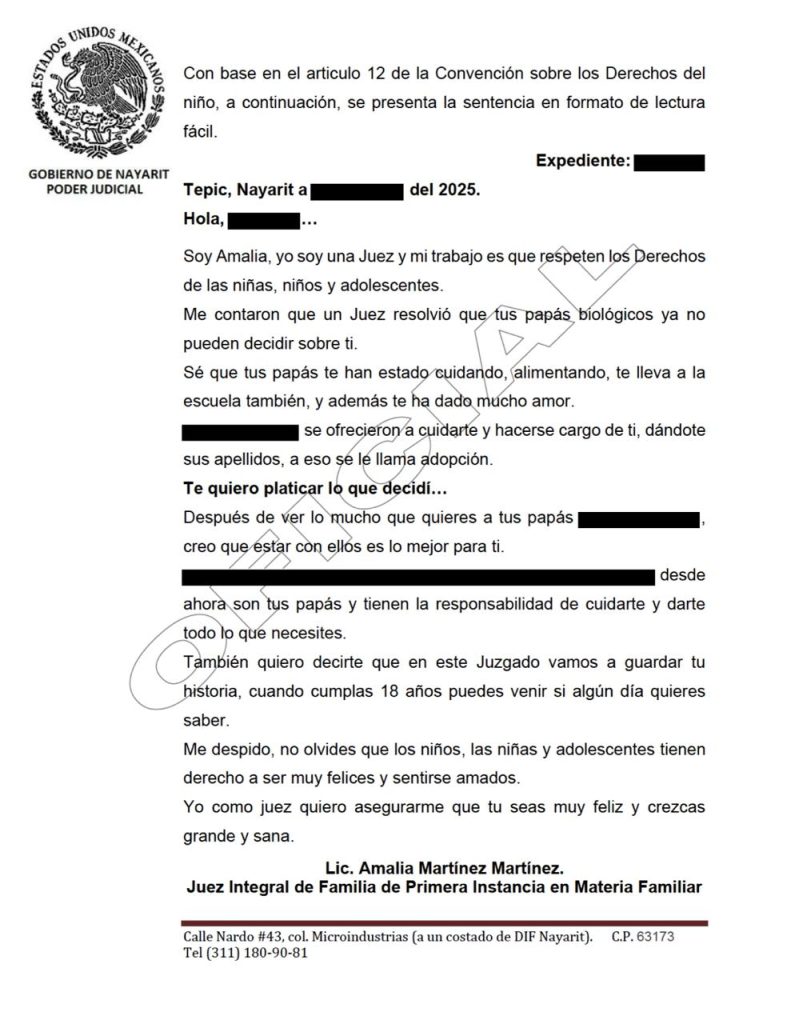 En el Poder Judicial del Estado de Nayarit se reconoce la importancia de que niñas, niños y adolescentes sean escuchados y comprendan, de manera adecuada a su edad, las decisiones judiciales que les afectan directamente.