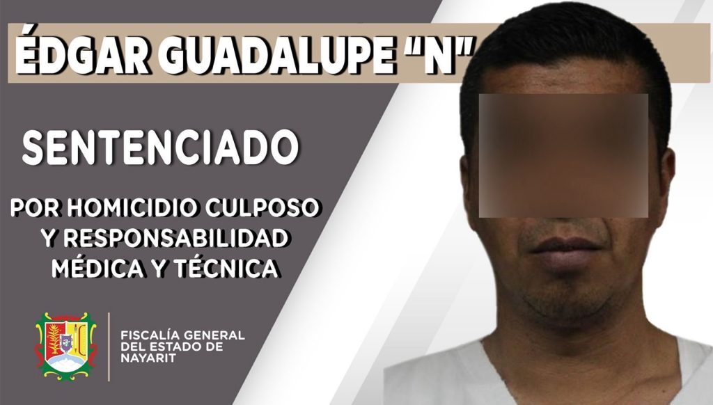 Fiscalía General del Estado de Nayarit obtuvo, en audiencia de juicio oral, fallo condenatorio por 4 años y 6 meses contra Edgar Guadalupe “N” por los delitos de homicidio culposo y responsabilidad médica y técnica, en agravio de un recién nacido y de su madre, cuya identidad se reserva para proteger su integridad y privacidad.