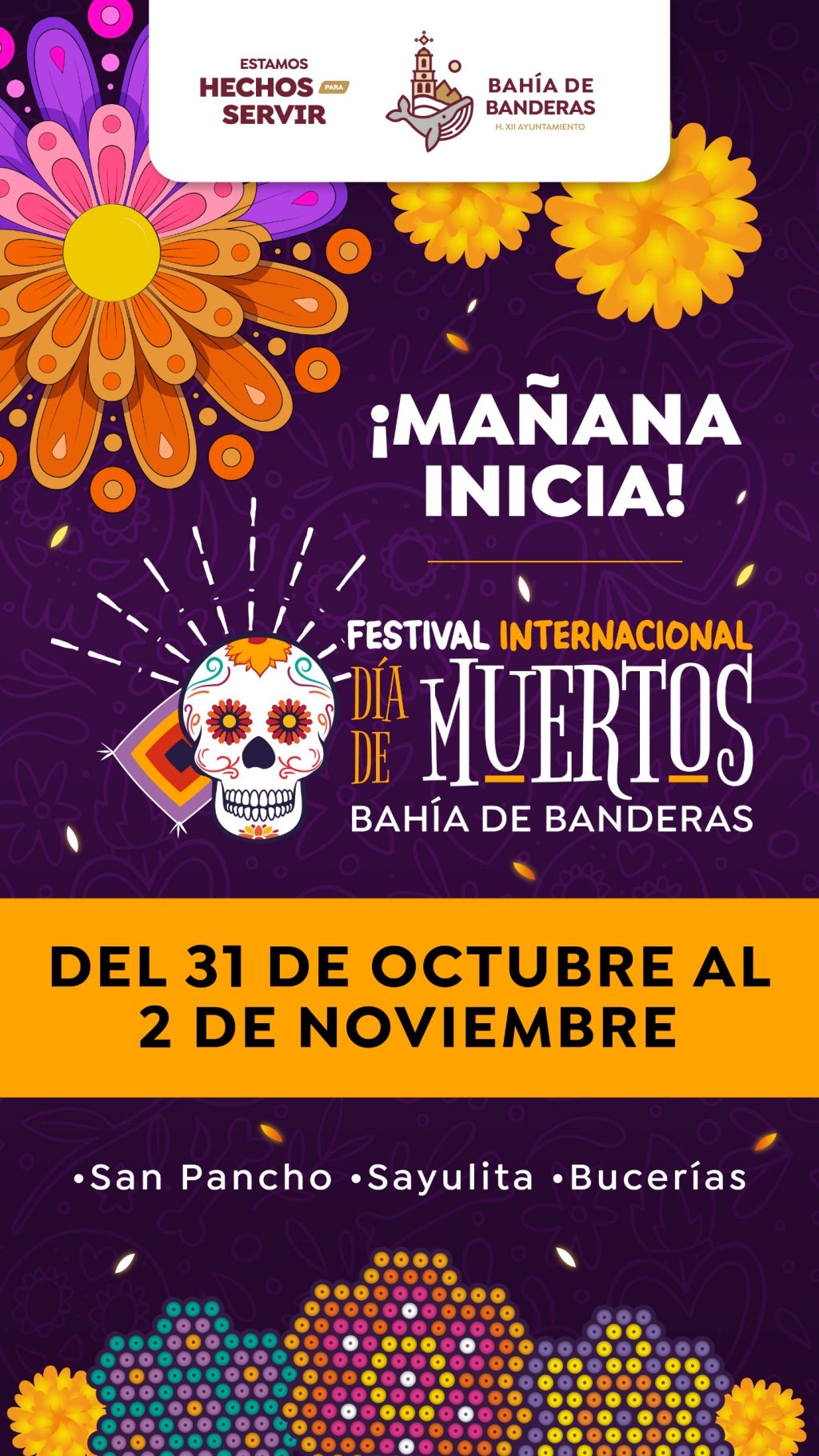 Con actividades llenas de color y tradición, mañana da inicio el Festival Internacional de Día de Muertos Bahía de Banderas 2025, que se celebrará del 31 de octubre al 2 de noviembre en San Pancho, Sayulita y Bucerías.